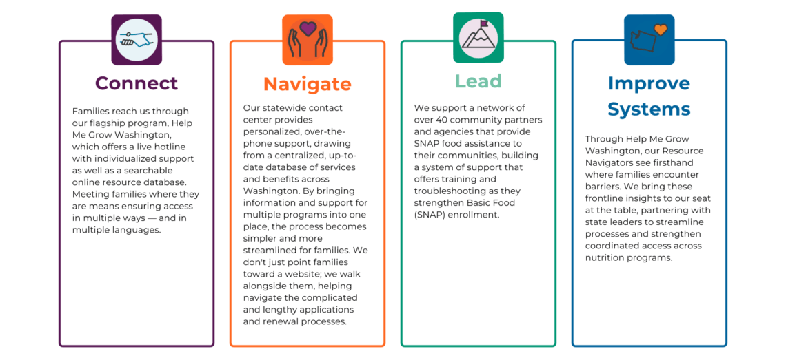 We serve as a primary link between Washington families and critical food access programs, including SNAP (known in Washington as Basic Food), WIC, and local food banks — ensuring families can access the nutrition they need to stay healthy and strong.